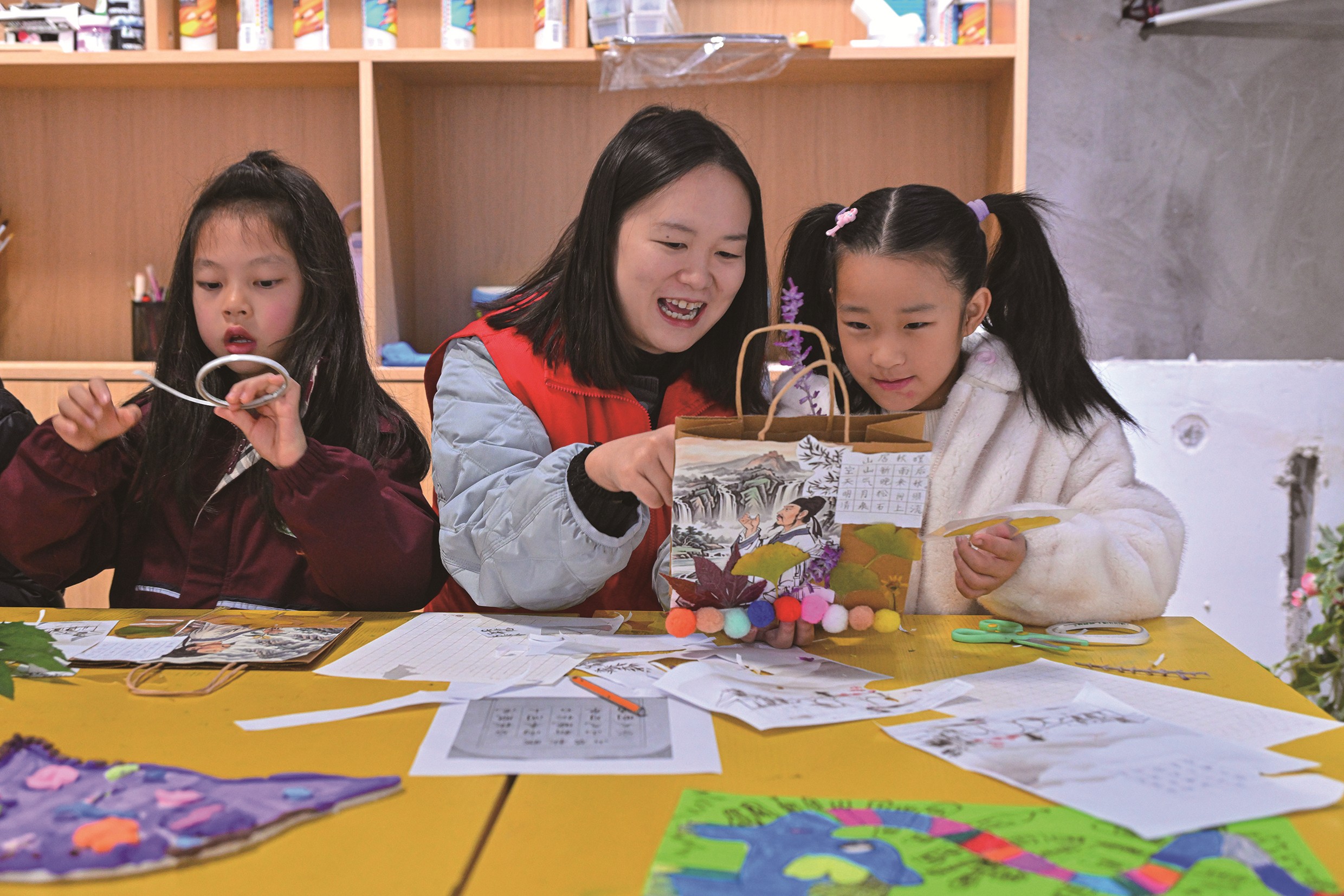 秋假期间,仁寿县委社会工作部、县总工会为双职工、新就业群体家庭的孩子提供爱心托管服务。图为仁寿县普宁街道黎光社区儿童活动综合体内,志愿者正在指导孩子拼贴秋日图景。(潘帅 摄)