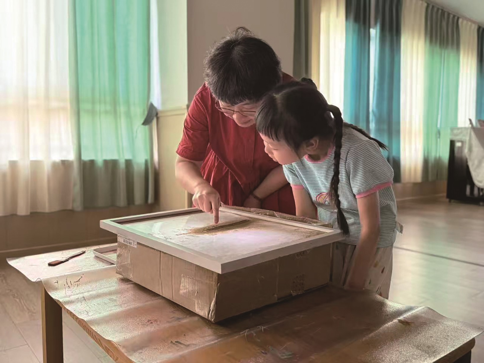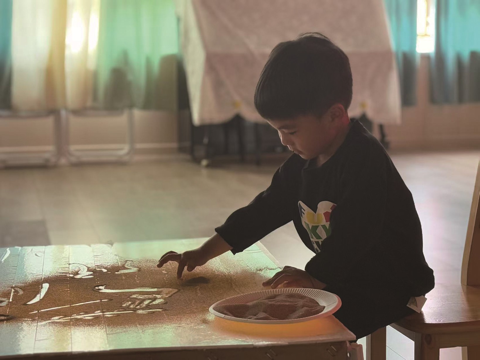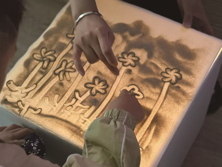 四是社会交往能力。不管是自制沙画箱,还是进行沙画创作,以及制定规则,孩子们需要不断进行协作、对话、解决矛盾、互相讲述并欣赏作品等等。在此过程中,孩子们不仅建立了友谊,还学会了解决问题、如何与他人合作,同时不同年龄段的孩子还学会互相照顾、彼此学习。