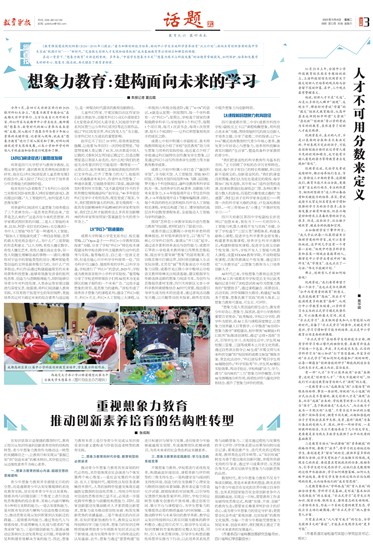 开展想象力教育,学校要进行系统性变革,构建涵盖环境创设、课程革新与评价转型的三维支持生态:一是构建安全与浸润的支持性环境。创造力的生发依赖于心理安全与物质环境的双重保障。教育者应着力营造允许试错、鼓励探索的对话氛围,以引导性反馈替代标准答案评判。同时,学校空间应转型为激发创意的开放场域,通过创客空间、展示平台与课程留白,为学生想象力的发展提供必要的物质基础与时间保障。二是推动跨学科与未来导向的教学革新。教学应从知识传授转向以真实问题为载体的跨学科整合。通过项目式学习,驱动学生完成从知识理解到方案构建的完整认知过程。同时,引入未来思维训练,引导学生构想前瞻性场景并反推当下行动,以此培养其系统思维与战略想象力。三是实施过程性与发展性的多元评价。评价体系需从结果导向转向成长记录,重视创意产生、迭代优化的过程性表现。教师角色应同步转型,从“知识权威”转变为善于提出催化创新问题,并提供资源支持的引导者。通过学习成果评估、反思报告等方式,真实反映学生想象力与创新思维的品质。