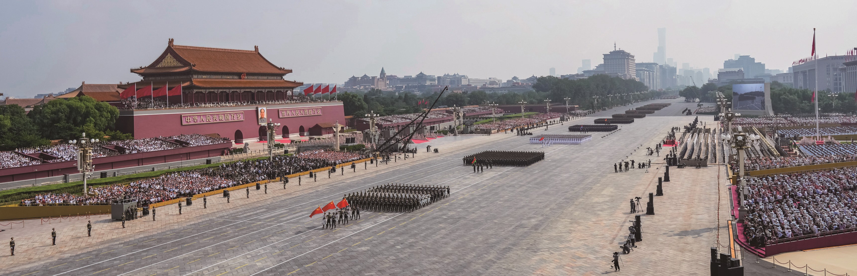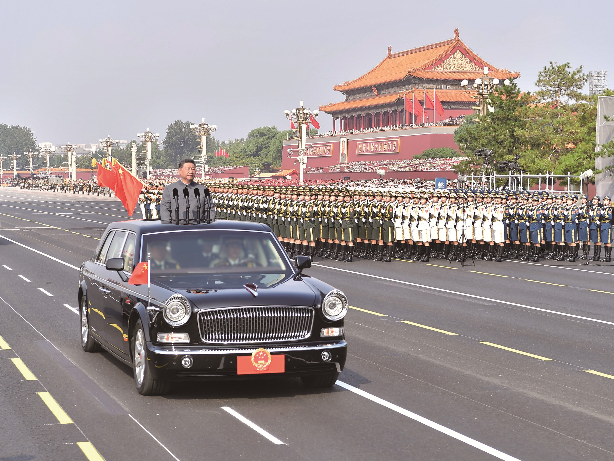 雄壮的军乐声中,习近平乘车沿着宽阔的长安街,依次检阅13个徒步方队、1个战旗方队、22个装备方队。受阅部队军容严整、意气风发,铁甲战车整齐列阵、威风凛凛。这是人民军队奋进建军百年的崭新亮相,这是中华民族捍卫世界和平的坚定宣示。