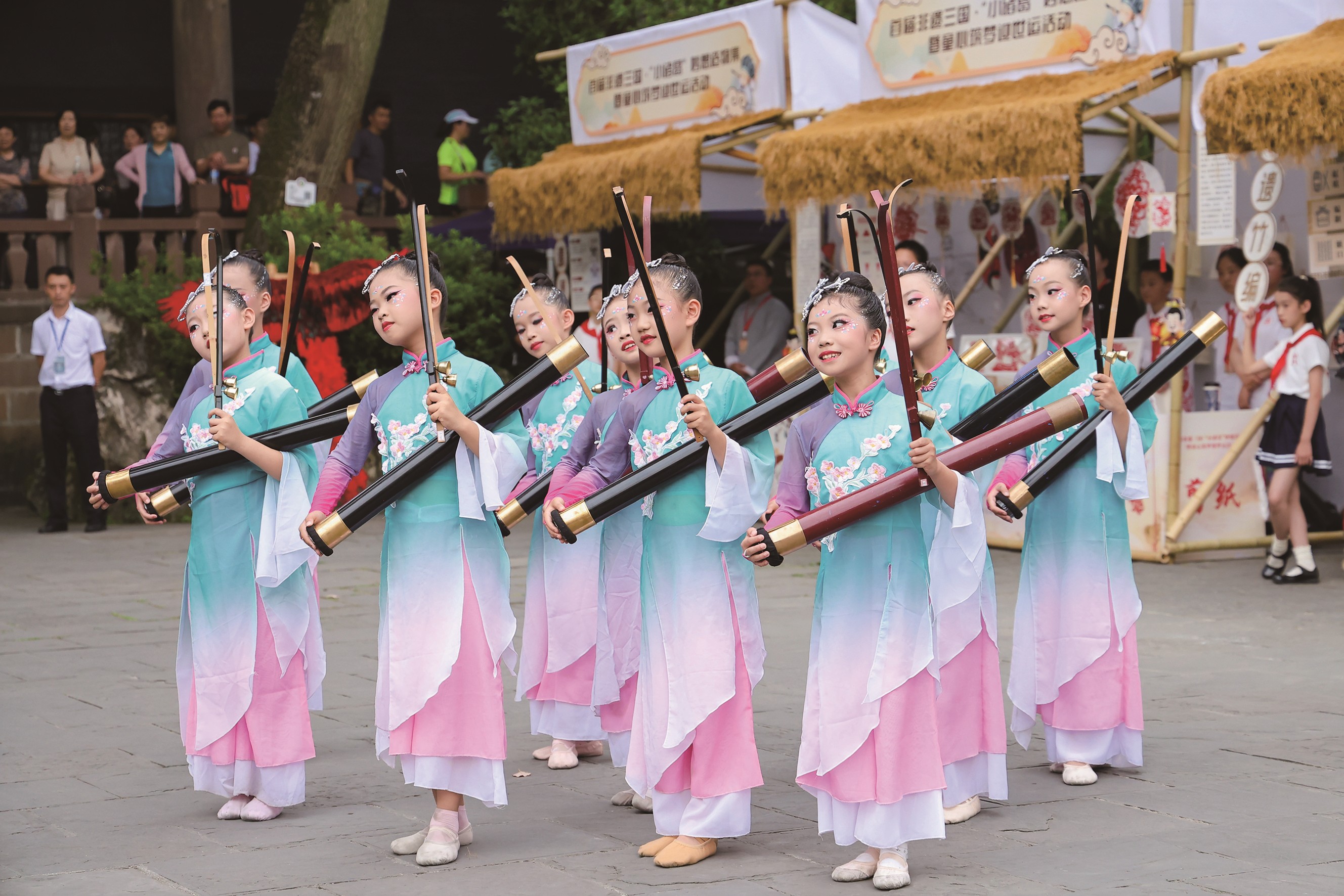 成都市龙江路小学分校竹琴社团的学生在武侯祠表演。(图片由学校提供)