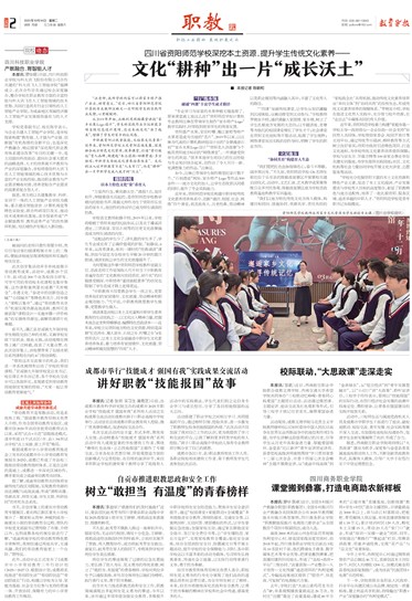 中职教育何以既重技能,又培养文化素养?近年来,资阳师范学校立足资阳区域发展,深度融合地方特色文化资源,改革课堂,打造“资行致远”育人品牌,构建起“本土浸润·四课贯通·多方协同:中职学生传统文化素养培养体系”。文化的注入让中职教育不是“人生窄门”,而是“耕种”出一片中职学生成人成才的“沃土”。