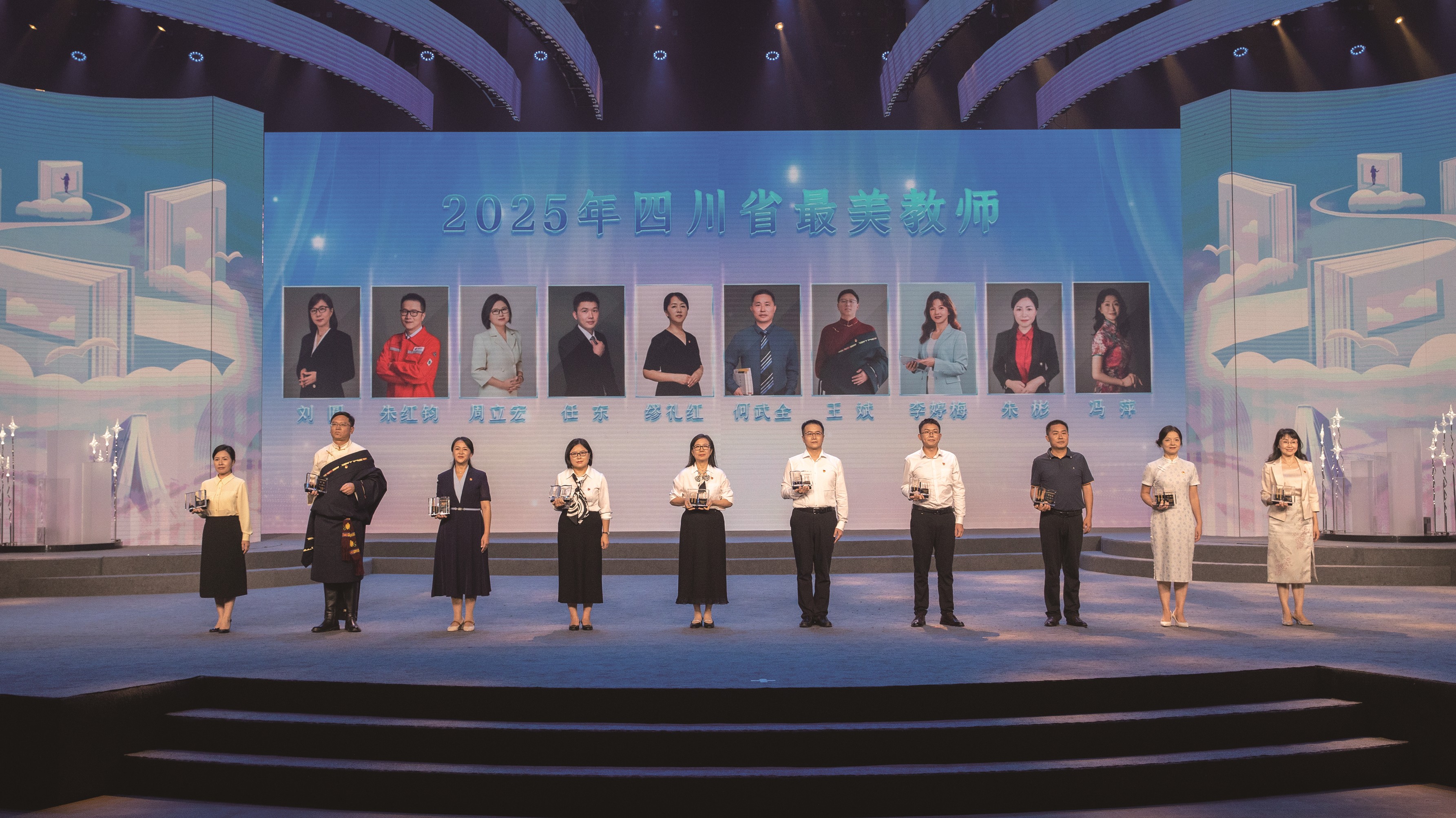在我省庆祝第41个教师节主题活动现场,10位2025年四川省“最美教师”上台领奖。