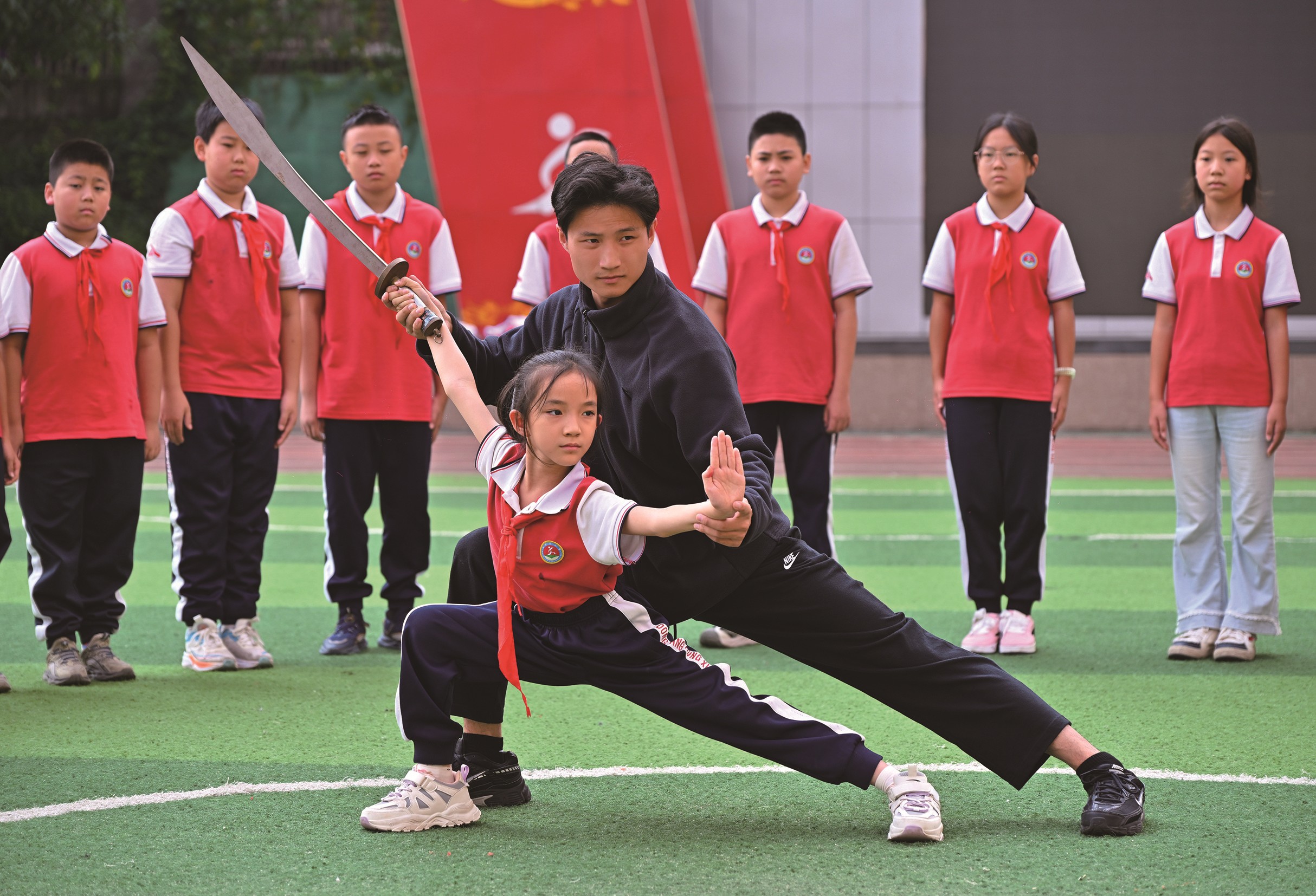 近日,在课间活动上,眉山市仁寿县东方红小学校学生在教练的指导下练习武术。近年来,东方红小学校将传统武术引入课间和社团活动,向学生普及武术基本动作和知识,丰富学生课余生活、强身健体。