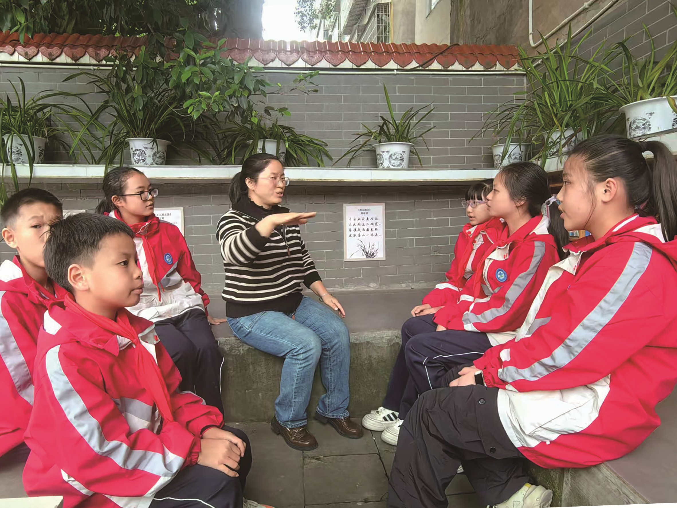 这所占地面积不到10亩的乡镇学校,自西南向东北顺着地势自然呈现出三级阶梯。第一层阶梯的小操场里分“诗心向党”“诗咏祖国”“诗润德育”“诗诵自然”4个主题,展示出名家名师、师生诗词作品;拾阶而上,第二层阶梯的操场则以梅兰竹菊“花中四君子”打造出一个个精致的园艺角落,配以古诗词和师生自主创作的咏物诗,学生们在此吟诵、游戏,呈现出一幅动人的诗词画;走上第三层阶梯,远远地就能听到教室里传出二年级学生伴着音乐吟诵《春晓》的欢快童声。