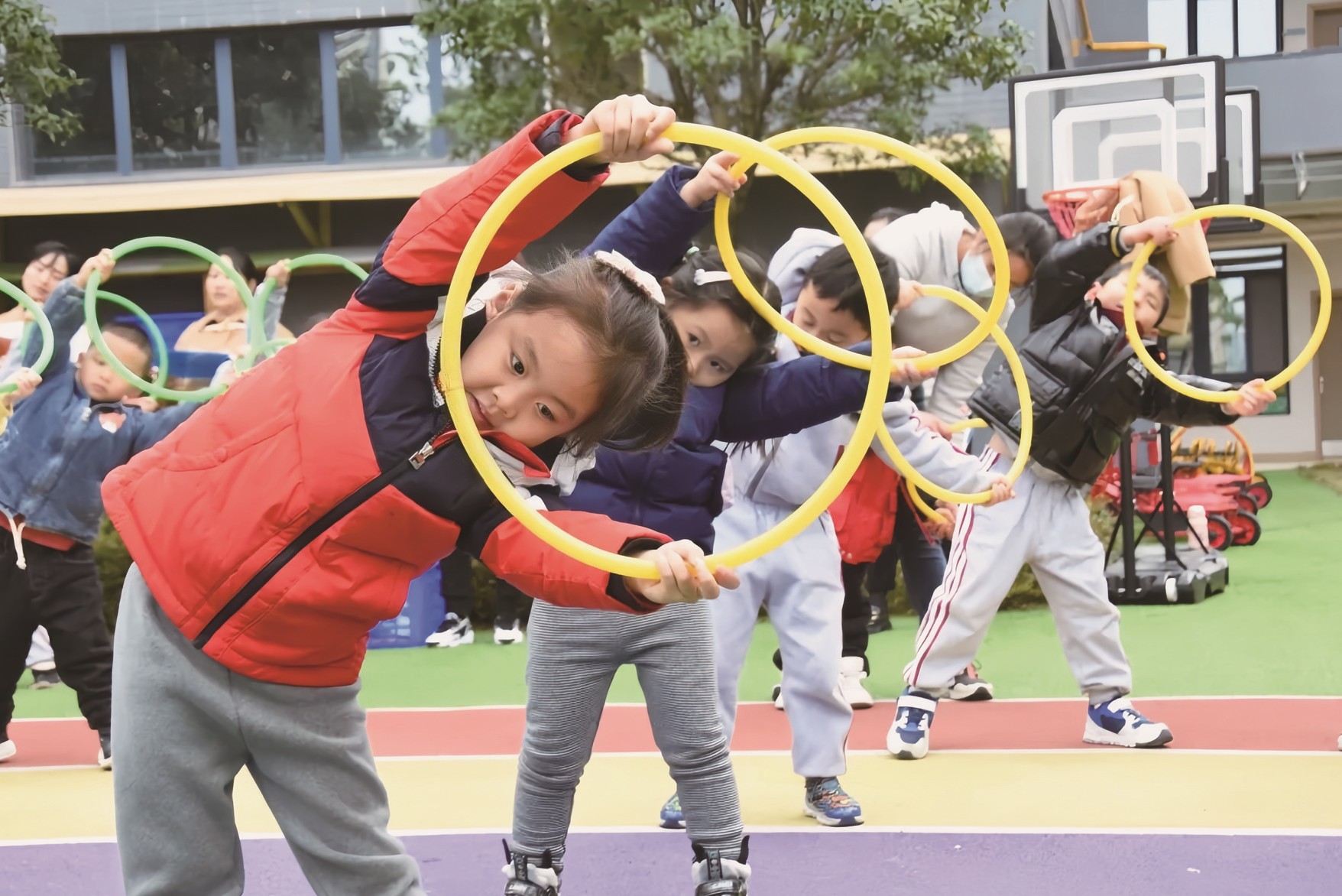 冬日的清晨,四川天府新区雅悦幼儿园的孩子们用呼啦圈玩“圈圈套”组合游戏。(图片由幼儿园提供)