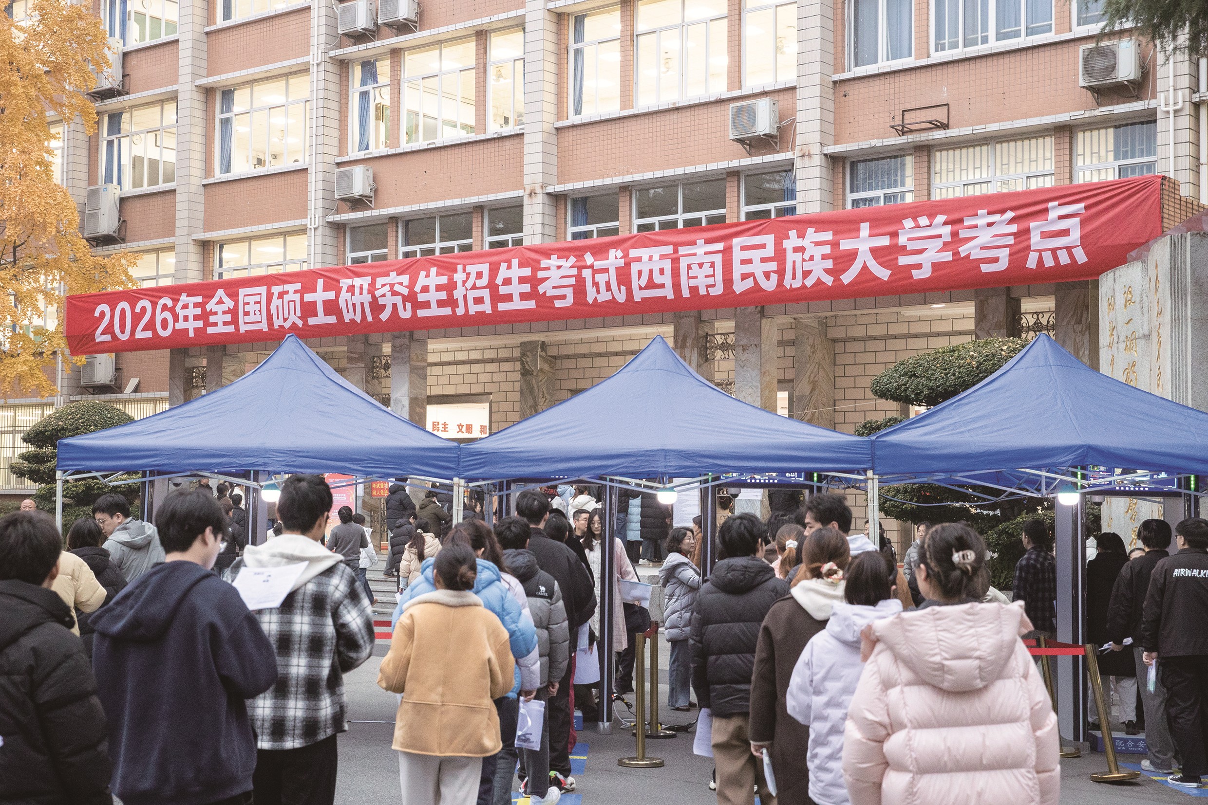 本报讯(记者 陈朝和 摄影报道)12月20日清晨,伴随着晨曦的第一缕阳光,2026年全国硕士研究生招生考试西南民族大学考点的考生有序进场。校门口,学校安保人员仔细查看考生准考证信息,志愿者们热情迎接到校考生,指引大家将书包、手机等随身物品放置到储物柜里;部分考生一早抵达考点后,仍手持复习资料在考场外抓紧最后时间冲刺。