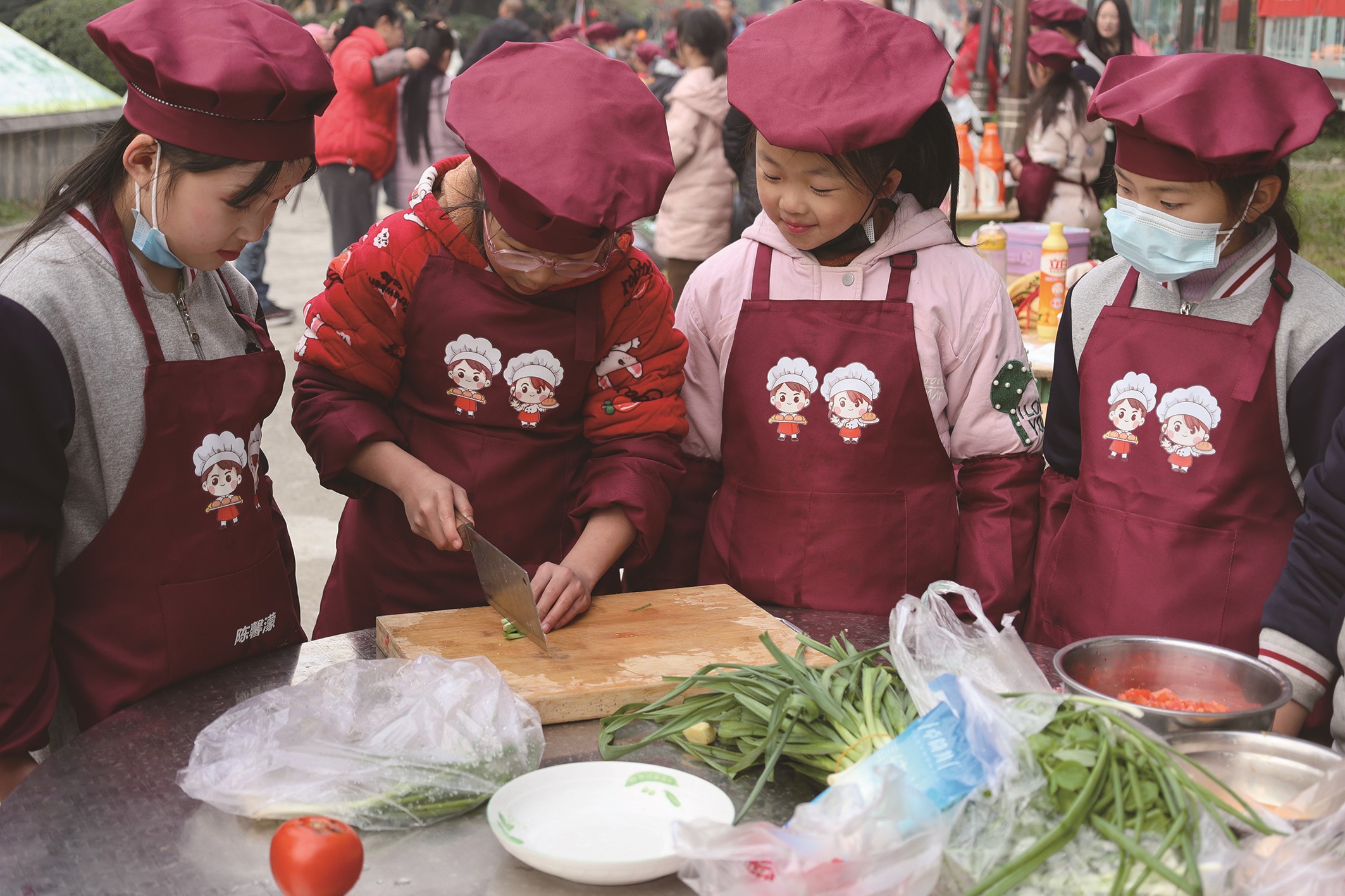 “古风坝坝宴”在宝林小学已有5年历史,如今已形成独具特色的校园“调元川菜节”。在这所200余人的乡村小学里,“调元川菜节”不仅是一次劳动教育的集中展示,也是孩子们和家长互动的温暖时光。