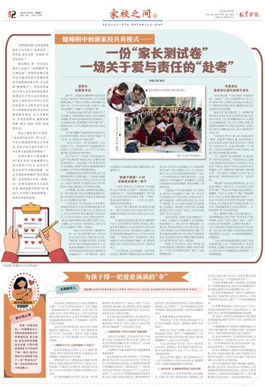 “从一份份的‘家长测试卷’中,我们看到了很多家长的成长。”学校团委书记、道德与法治教师宋琼芳回顾4年多来家长“考试态度”的转变,谈及不少家长从最初只答主观题的“应付”,渐渐变成“越写越多,越写越认真”。“家长看到了试题的专业和严谨,也越发认同了我们的家校共育工作。”宋琼芳说。