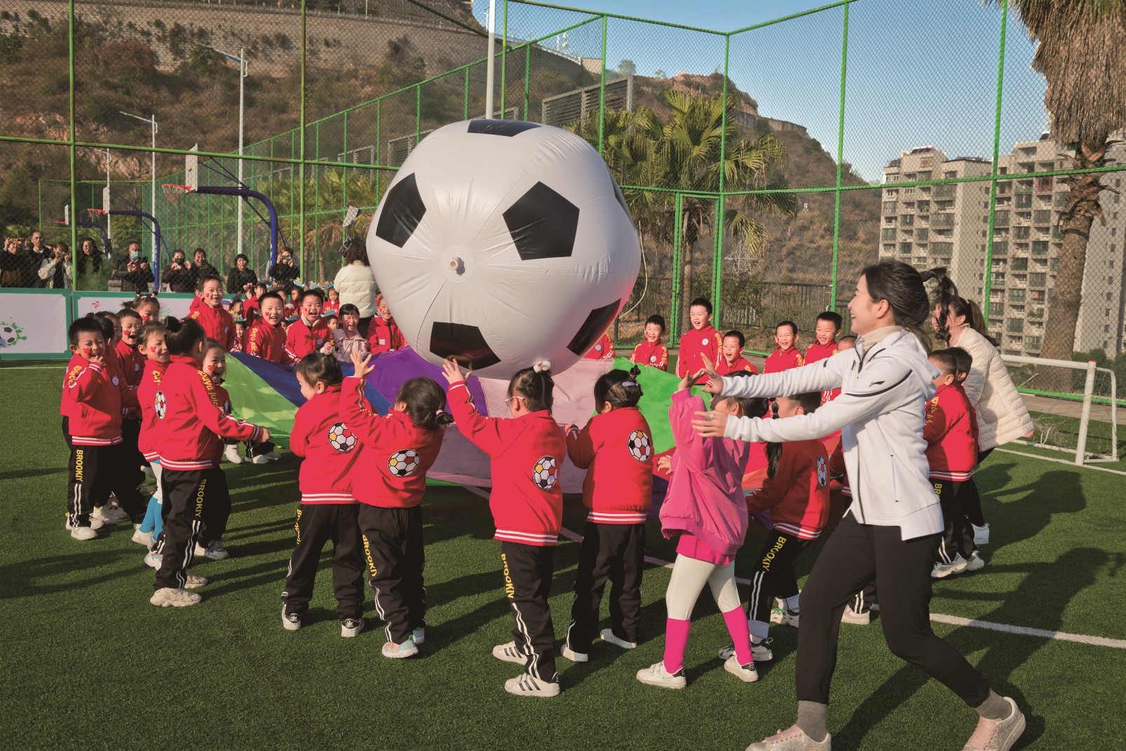 冬日的阳光洒满攀枝花市炳草岗二街坊幼儿园奥林匹克分园(以下简称“奥林匹克分园”)的绿茵场,大二班与大三班的孩子们身着红色、黄色的队服,在裁判员一声哨响后展开激烈角逐。带球、抢断、射门……小球员们奔跑的身影与场边“加油!传球!”的呐喊声交织在一起,一场精彩的足球联赛正火热上演。这场看似简单的比赛,正是该园将体育运动深度融入幼儿一日活动与课程体系的生动缩影。