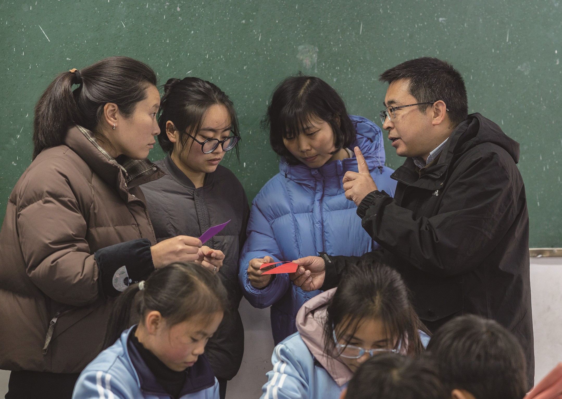 雷波县永盛镇中心校,教育厅驻村帮扶干部、省教科院教研员朱雪林(右一)发挥专业所长,指导基层教师创新课堂教学方式。