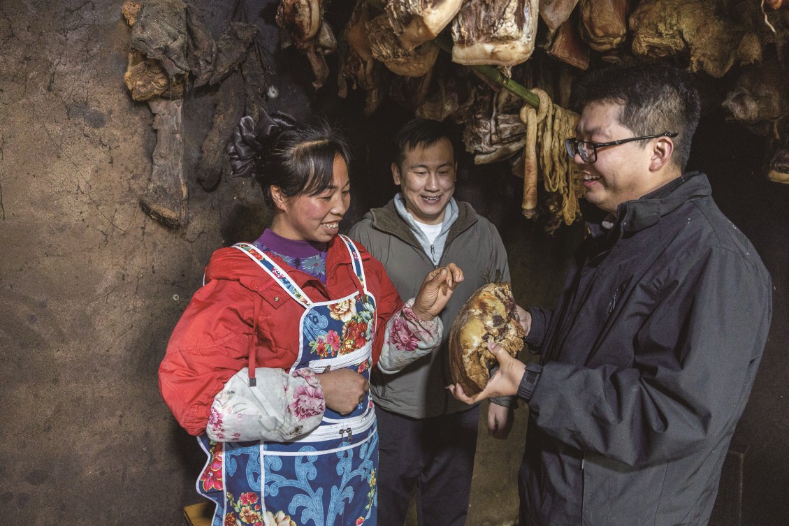 教育厅驻村帮扶干部陈磊(右)、赵睿祥(中)走进雷波县永盛镇欧家山村农户家中,探讨特色腊肉产品的加工与销售。