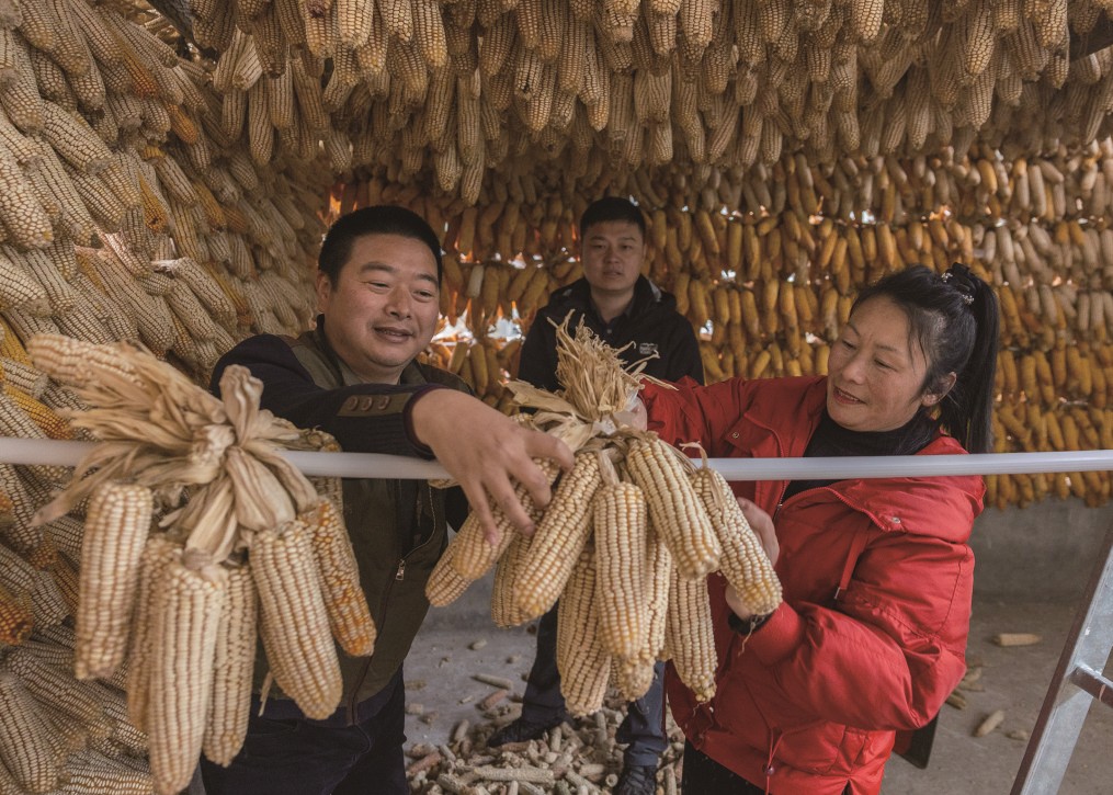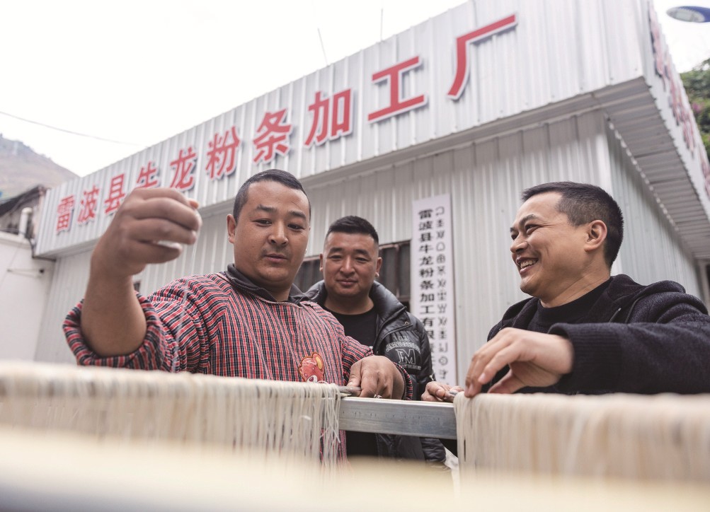 教育厅捐资50万元建起雷波县牛龙粉条加工厂,助力乡村振兴。图为教育厅派驻雷波县马颈子镇牛龙村第一书记黄玉林(右一)与村民一起晾晒粉条。