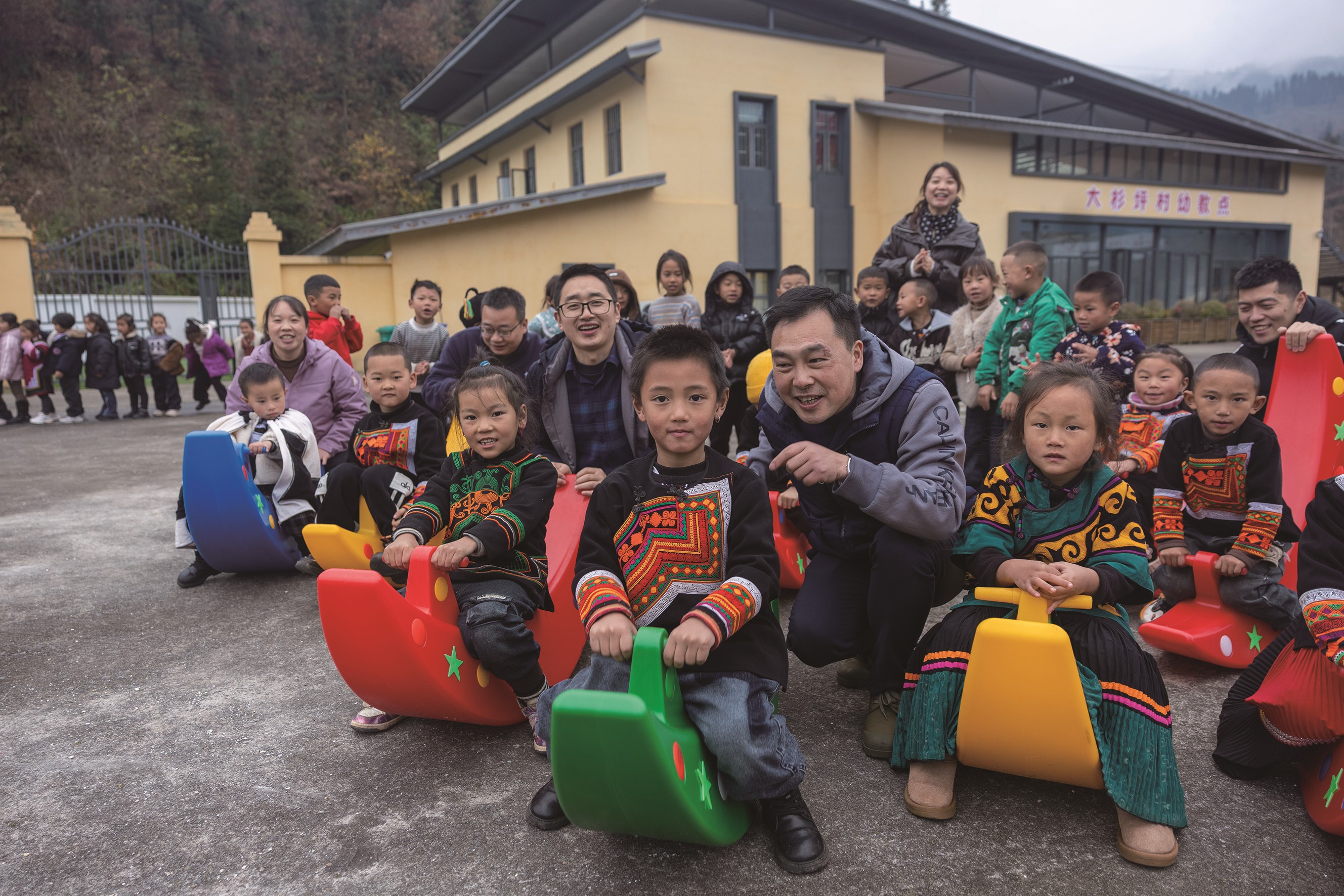 雷波县黄琅镇大杉坪村幼教点,教育厅驻村帮扶干部刘旭芳、汤平等与孩子们一起玩耍。该幼教点校舍由教育厅援建。
