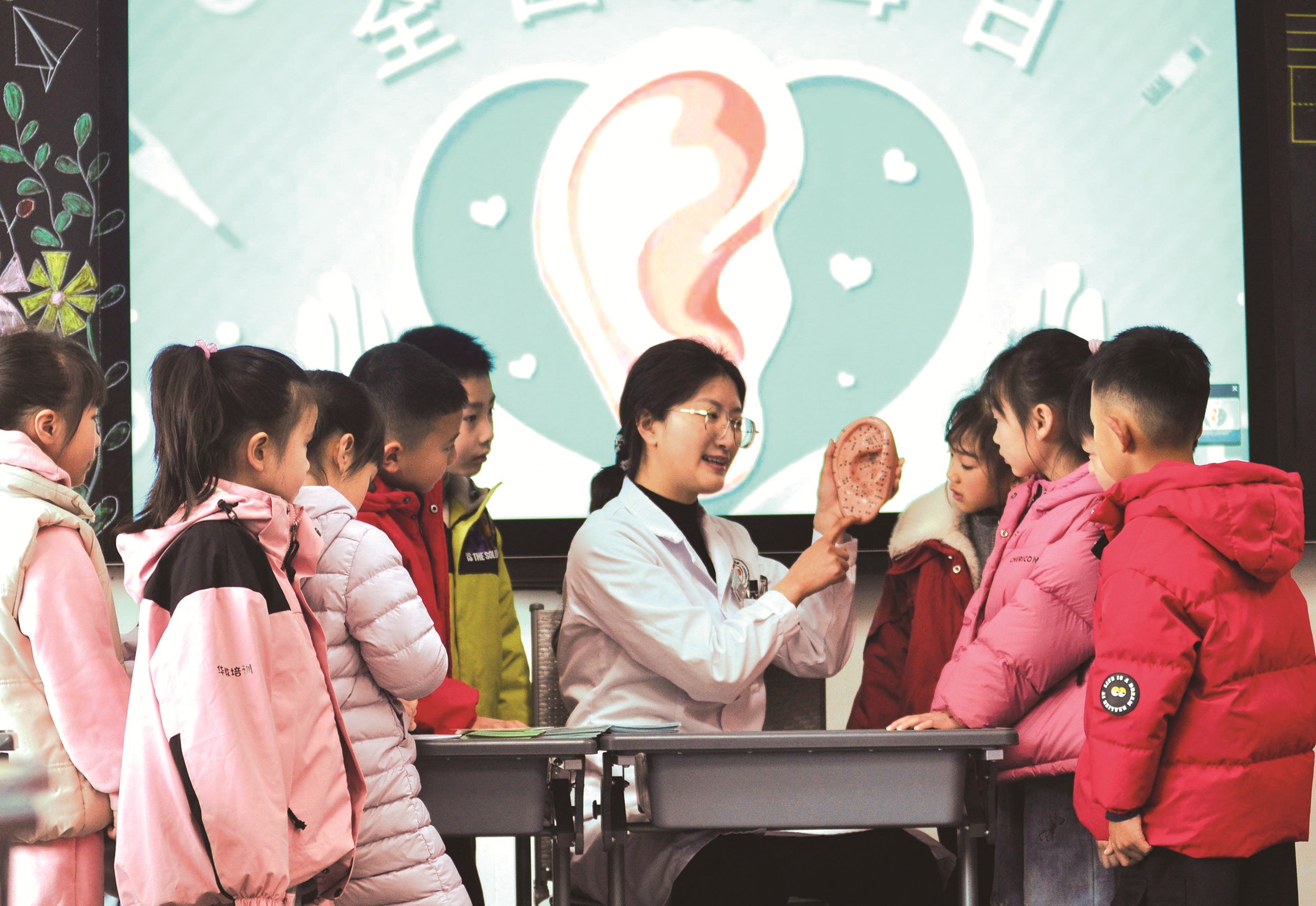 第27个全国“爱耳日”,绵阳市安州区卫健局联合区教体局、区残联开展“全民科学爱耳,共护听力健康”主题科普活动。安州区中医院医师通过演示中医护耳适宜技术、普及中医护耳知识,让学生感受中医文化的博大精深。图为绵阳市安州区中医院医师为调元实验小学学生介绍中医耳部穴位。