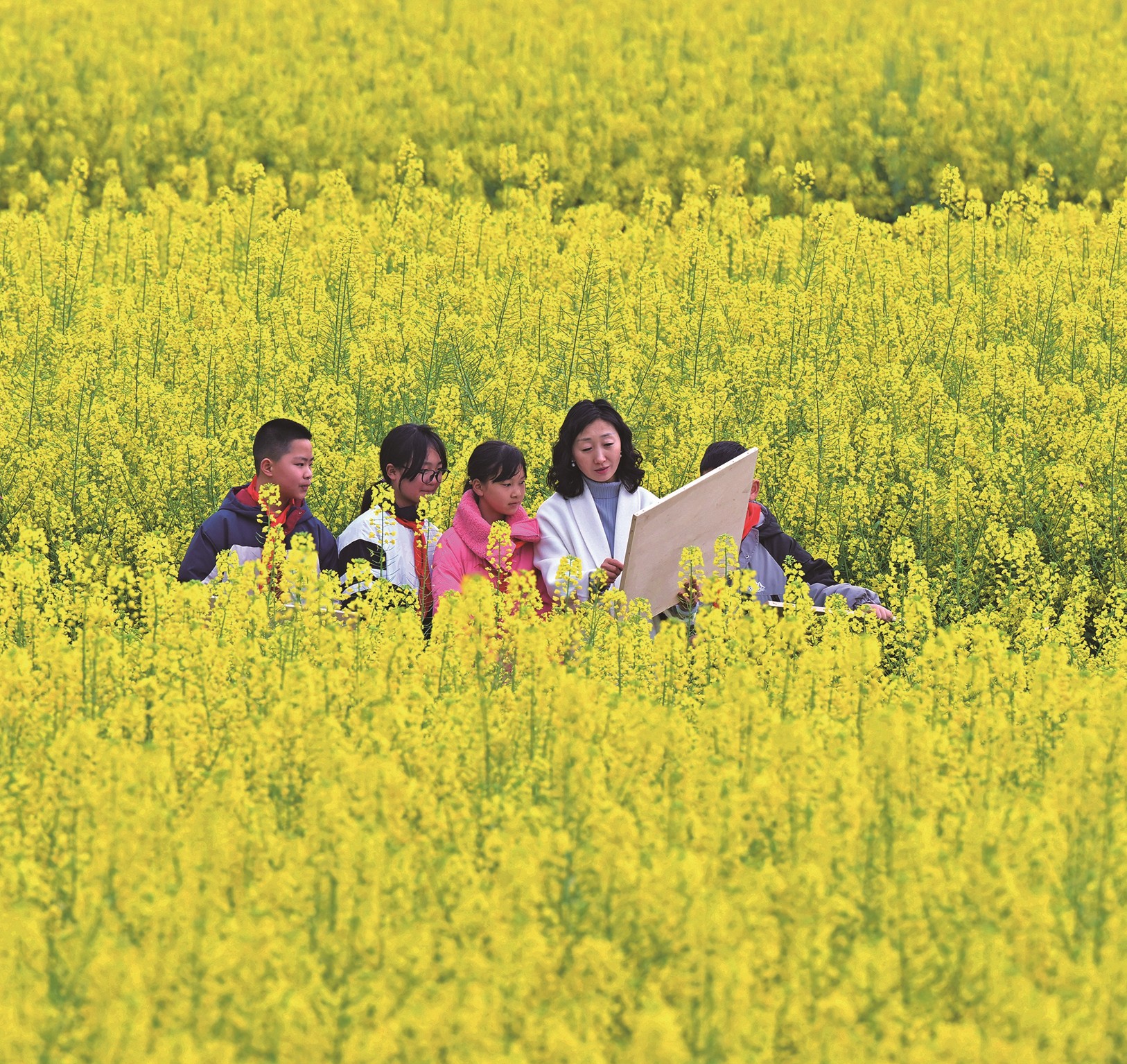 日前,仁寿县珠嘉镇花园九年制学校开展“走进花海绘春天”主题活动,老师带领学生走进油菜花田间,指导学生用画笔描绘春天的多彩美景。图为师生在油菜花田写生。