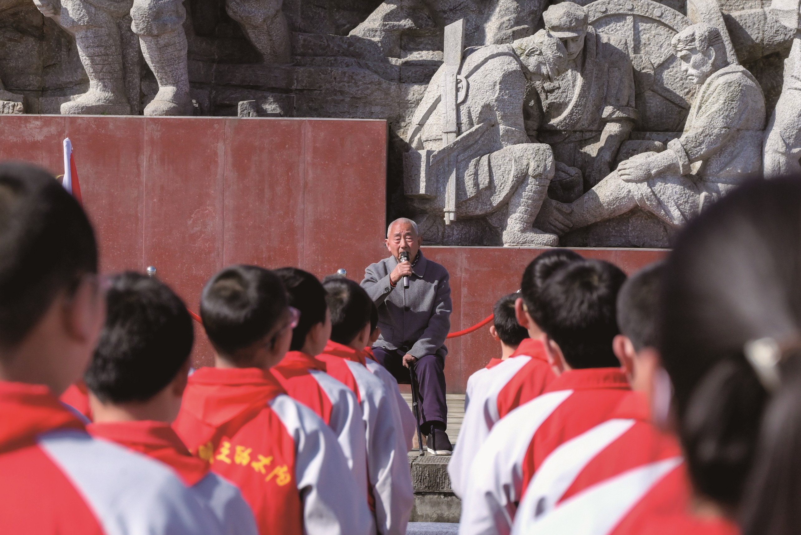 74岁的义务守墓人王建刚单膝跪地,细心擦去墓碑上的灰尘,与学生共握一支毛笔,蘸上鲜红的油漆,一笔一画修补墓碑上五角星的边角。阳光洒落,鲜亮的红星与学生胸前的红领巾交相辉映。
