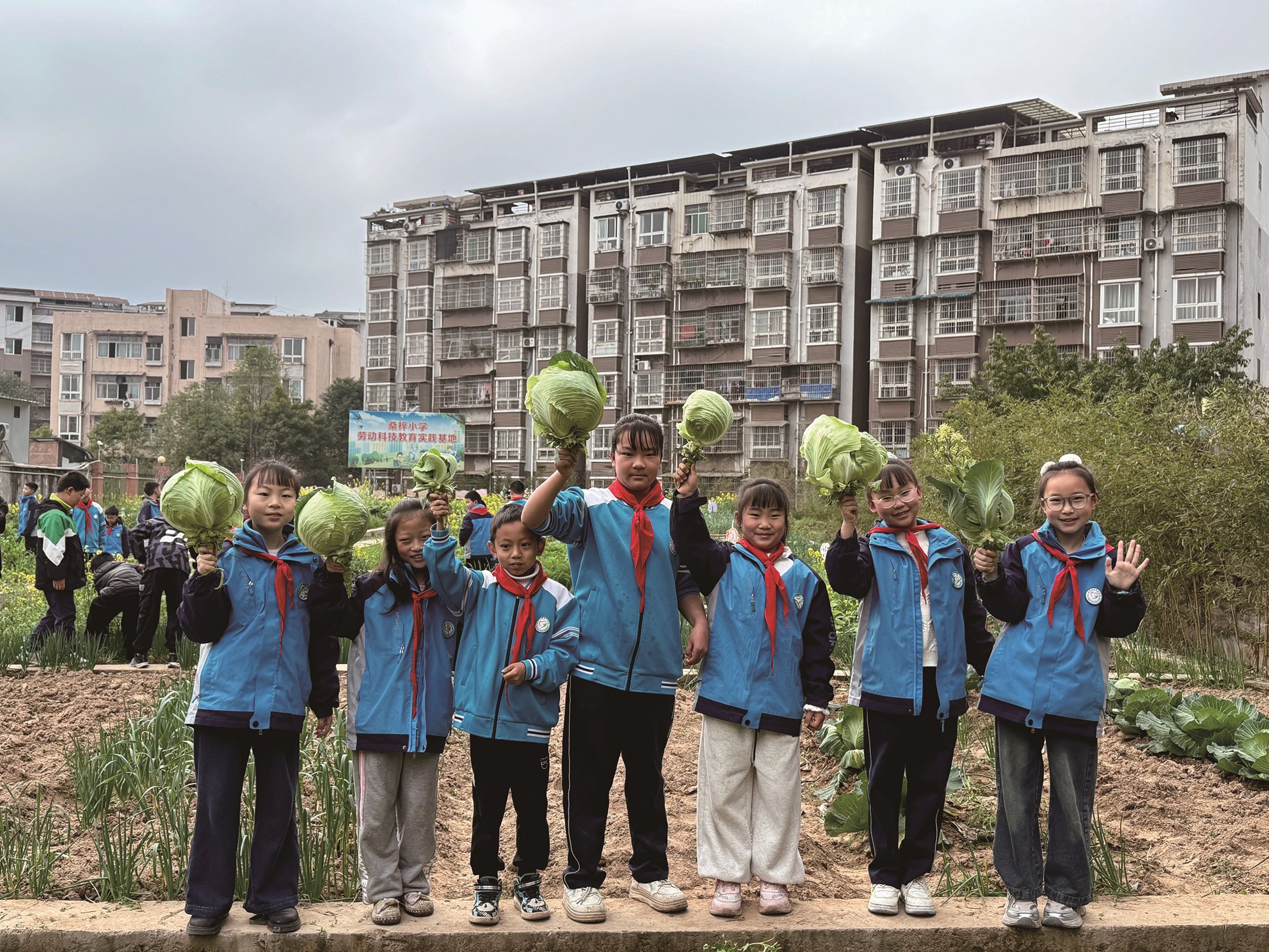 蓬安县桑梓小学校学生在劳动科技教育实践基地采摘莲花白,享受丰收的喜悦。(图片由学校提供)